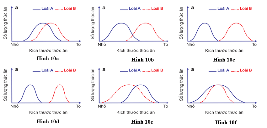 Hai loài A và B cùng phân bố trong một khu vực, ổ sinh thái về thức ăn của 2 loài A và B được thể hiện ở các Hình 10 sau đây: Có bao nhiêu hình thể hiện loài A và loài B có cạnh tranh nhau về thức ăn?