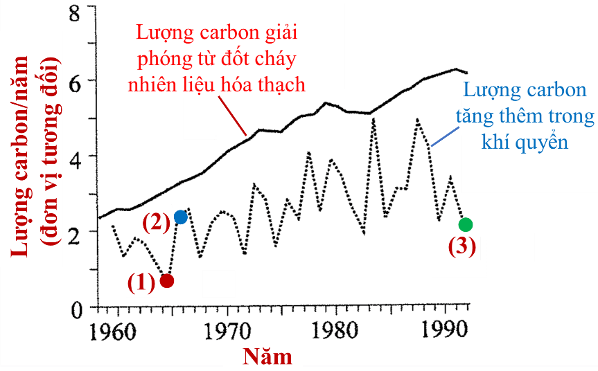 b) Trong thời gian nghiên cứu, lượng carbon trong khí quyển không ngừng tăng.