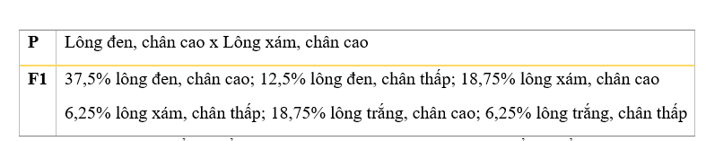 c) Chọn ngẫu nhiên 2 cá thể lông đen, chân thấp ở F1 cho giao phối với nhau, ở đời con các cá thể lông xám, chân thấp chiếm tỉ lệ 18,75%.