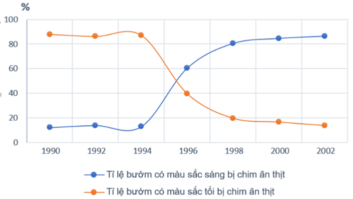 d. Dưới tác động của chọn lọc tự nhiên, quần thể bướm tăng cường tích lũy các biến dị thân có màu sắc sáng nhiều hơn thân có màu sắc tối.