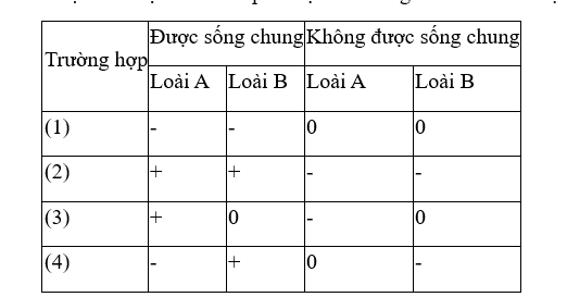 Bảng dưới đây mô tả sự biểu hiện các mối quan hệ sinh thái giữa 2 loài sinh vật A và B: Kí hiệu: (+): có lợi. (-): có hại. (0): không ảnh hưởng gì.