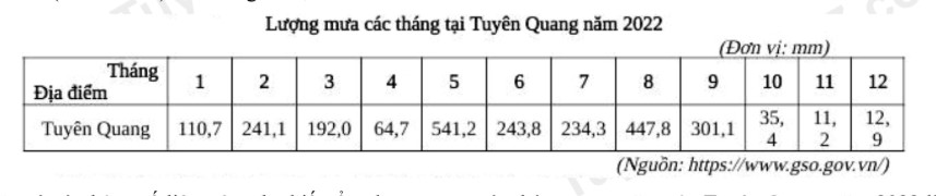 Căn cứ vào bảng số liệu trên, cho biết tổng lượng mưa các tháng trong năm của Tuyên Quang năm 2022 là bao nhiêu mm (làm tròn kết quả đến hàng đơn vị).
