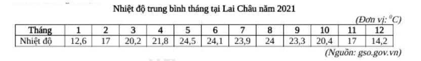 Căn cứ vào bảng số liệu trên, hãy cho biết nhiệt độ trung bình năm của Lai Châu năm 2021 là bao nhiêu°C (làm tròn kết quả đến một chữ số thập phân).