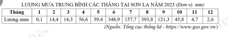 Theo bảng số liệu, tính tổng lượng mưa của trạm khí hậu Sơn La năm 2023 (làm tròn kết quả đến hàng đơn vị của mm).