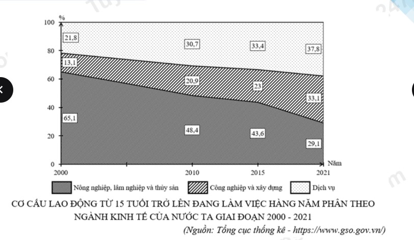 Tỉ trọng lao động trong ngành dịch vụ tăng liên tục; ngành công nghiệp, xây dựng giảm.