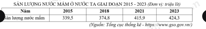 Theo bảng số liệu, tính tốc độ tăng trưởng sản lượng nước mắm ở nước ta giai đoạn 2015 - 2023 (làm tròn kết quả đến hàng đơn vị của %).