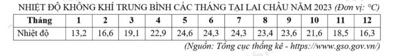 Theo bảng số liệu, tính biên độ nhiệt độ của trạm khí hậu Lai Châu năm 2023 (làm tròn kết quả đến hàng đơn vị của °C).