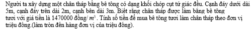 d) Mái nhà bác An được lợp bằng ngói đất nung Đất Việt, giá tiền mỗi viên ngói là 11.000 đồng và để lợp được 1 m² diện tích mái cần 22 viên ngói. Số tiền cần bỏ ra để mua ngói lợp mái nhà là 13.960.000 (không kể hao phí do việc cắt ghép các viên ngói, làm tròn kết quả đến hàng nghìn).