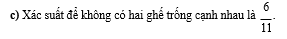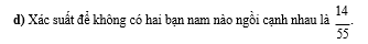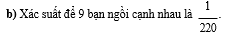 Một nhóm 12 bạn học sinh đặt mua 12 vé kề nhau trong một hàng có 12 ghế để xem bộ phim “Mưa Đỏ”. Tuy nhiên, đến hôm đi xem phim thì 3 bạn bận đột xuất nên chỉ có 9 bạn gồm 4 bạn nam và 5 bạn nữ đi xem phim. Nhân viên rạp chiếu phim sắp xếp ngẫu nhiên cho 9 bạn vào 9 trong 12 ghế đã mua( mỗi bạn một ghế).