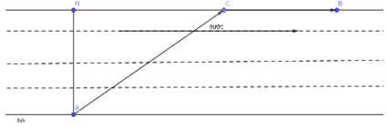 Trong một buổi tập luyện của lính đặc công, một chiến sỹ cần phối hợp bơi và chạy bộ để từ điểm $A$ ở bờ sông bên này đến điểm $B$ về phía hạ lưu của bờ sông bên kia (tham khảo hình vẽ bên dưới).Chiến sỹ dự định bơi thẳng từ điểm $A$ đến một điểm thuộc đoạn $HB$ sau đó chạy từ điểm đó về điểm $B$. Biết $AH = 300\text{ m}$, $HB = 900\text{ m}$, vận tốc dòng nước là $1\text{ m/s}$, vận tốc bơi của chiến sỹ đối với nước là $1\text{ m/s}$ và vận tốc chạy trên bờ của chiến sỹ là $3\text{ m/s}$.Hỏi chiến sỹ cần ít nhất bao nhiêu giây để hoàn thành kế hoạch trên? (làm tròn đến hàng đơn vị).