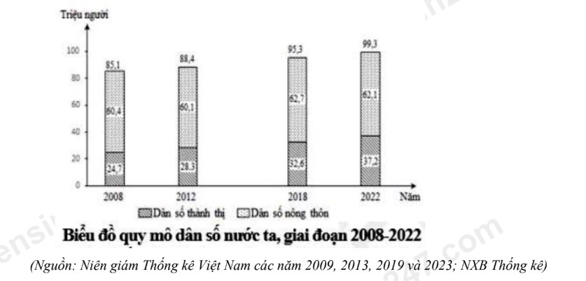Nhận xét nào sau đây đúng với biểu đồ trên về dân số nước ta, giai đoạn 2008 - 2022?