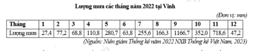 Căn cứ vào bảng số liệu trên, hãy tính tổng lượng mưa tại Vinh năm 2022 (làm tròn kết quả đến hàng đơn vị của mm).