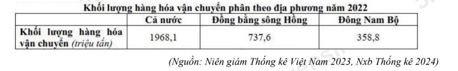 Căn cứ vào bảng số liệu trên, hãy cho biết tỉ trọng hàng hóa vận chuyển của vùng Đồng bằng sông Hồng trong tổng khối lượng hàng hóa của cả nước lớn hơn vùng Đông Nam Bộ bao nhiêu phần trăm (làm tròn kết quả đến một chữ số thập phân).