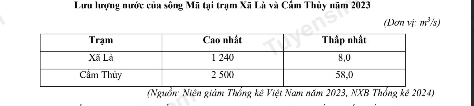 Căn cứ vào bảng số liệu trên, hãy cho biết sự chênh lệch lưu lượng nước cao nhất và thấp nhất tại trạm Xã Là và trạm Cẩm Thủy là bao nhiêu m3/s (làm tròn kết quả đến hàng đơn vị).