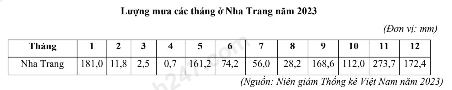 Căn cứ vào bảng số liệu trên, hãy cho biết tổng lượng mưa năm 2023 tại trạm quan trắc Nha Trang là bao nhiêu mm (làm tròn kết quả đến hàng đơn vị).