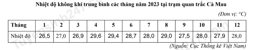Căn cứ vào bảng số liệu trên, hãy cho biết biên độ nhiệt độ trung bình năm 2023 tại trạm quan trắc Cà Mau là bao nhiêu 0C.
