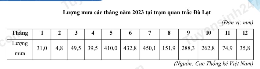 Căn cứ vào bảng số liệu trên, hãy cho biết tổng lượng mưa tại trạm quan trắc Đà Lạt là bao nhiêu mm. (làm tròn kết quả đến hàng đơn vị)