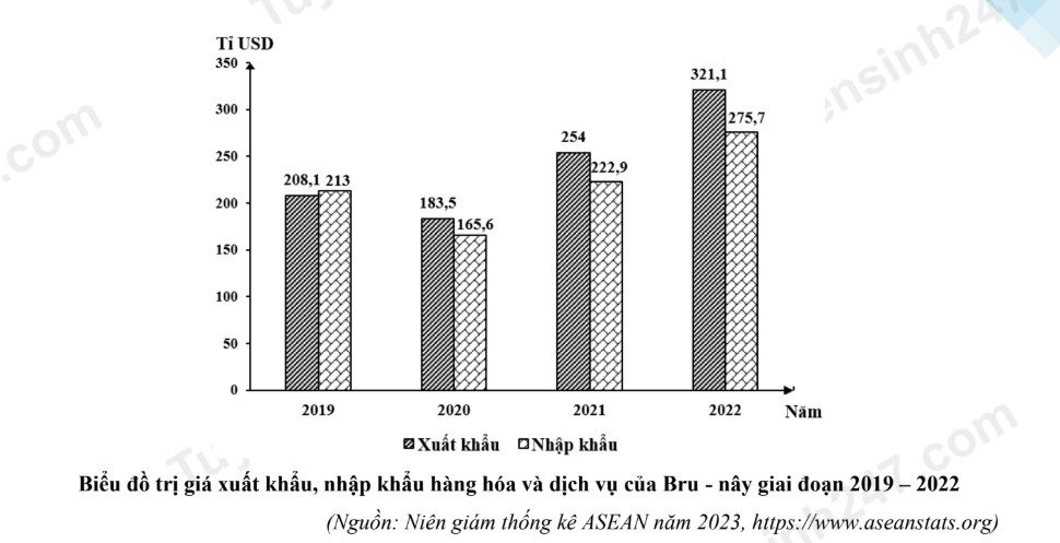 Từ năm 2019 đến năm 2022, Bru-nây có cán cân thương mại luôn xuất siêu.