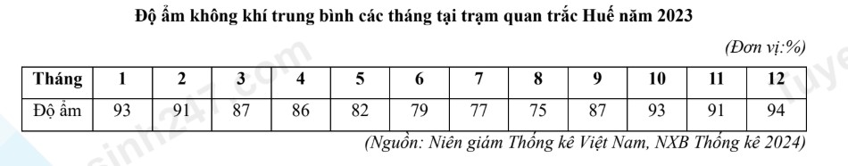 Căn cứ vào bảng số liệu trên, hãy cho biết chênh lệch giữa tháng có độ ẩm không khí trung bình cao nhất so với tháng có độ ẩm không khí trung bình thấp nhất là bao nhiêu %.