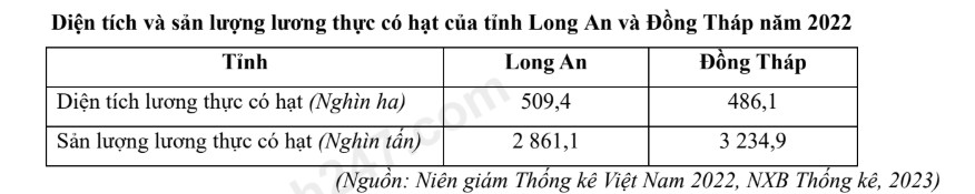 Căn cứ vào bảng số liệu trên, hãy cho biết năng suất lương thực có hạt của tỉnh Long An thấp hơn tỉnh Đồng Tháp bao nhiêu tạ/ha? (làm tròn kết quả đến một chữ số thập phân).