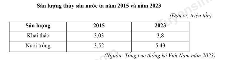 Căn cứ vào bảng số liệu trên, hãy cho biết tỉ trọng sản lượng thủy sản nuôi trồng của nước ta năm 2023 so với năm 2015 tăng thêm bao nhiêu phần trăm? (làm tròn kết quả đến một chữ số thập phân).