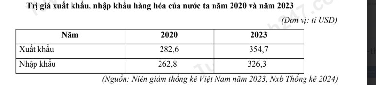 Căn cứ vào bảng số liệu trên, hãy cho biết giá trị xuất siêu năm 2023 gấp mấy lần giá trị xuất siêu năm 2020 (làm tròn kết quả đến hai chữ số thập phân) .