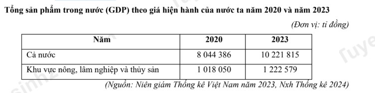 Căn cứ vào bảng số liệu trên, hãy cho biết tỉ trọng khu vực nông, lâm nghiệp và thủy sản năm 2023 giảm bao nhiều phần trăm so với năm 2020 (làm tròn kết quả đến một chữ số thập phân).