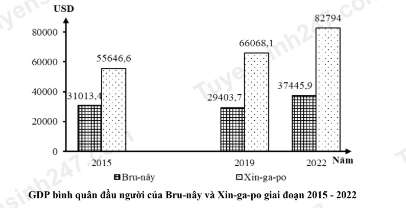 d) Năm 2022 so với năm 2015, GDP bình quân đầu người của Xin-ga-po tăng nhanh hơn của Bru-nây.