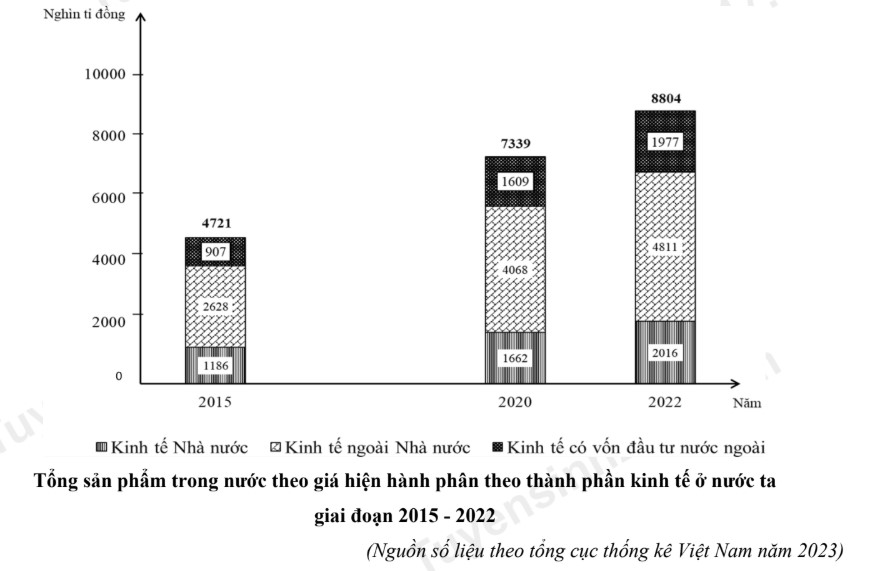 Nhận xét nào sau đây đúng về sự thay đổi trị giá sản phẩm của các thành phần kinh tế nước ta giai đoạn 2015 - 2022?