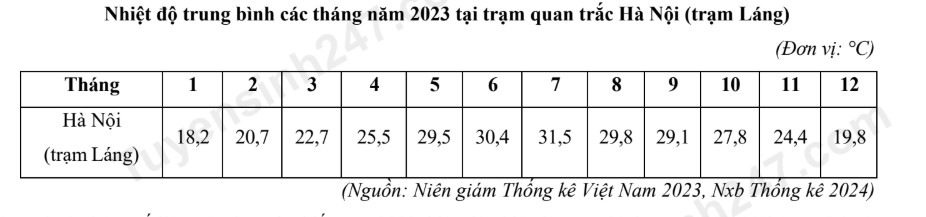Căn cứ vào bảng số liệu trên, hãy cho biết năm 2023, biên độ nhiệt độ trung bình năm tại Hà Nội (trạm Láng) là bao nhiêu °C (làm tròn kết quả đến hàng đơn vị).
