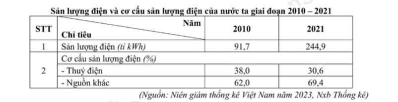 Căn cứ vào bảng số liệu trên, hãy cho biết sản lượng thuỷ điện năm 2021 cao hơn sản lượng thuỷ điện năm 2010 bao nhiêu tỉ kWh? (làm tròn kết quả đến một chữ số thập phân).