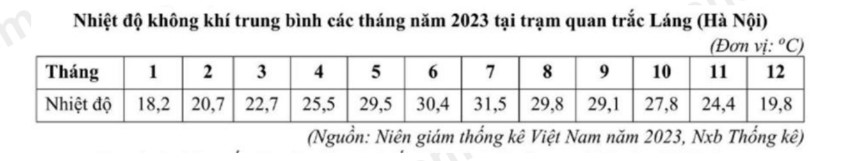 Căn cứ vào bảng số liệu trên, hãy cho biết biên độ nhiệt độ trung bình năm 2023 tại trạm quan trắc Láng (Hà Nội) là bao nhiêu °C? (làm tròn kết quả đến một chữ số thập phân).