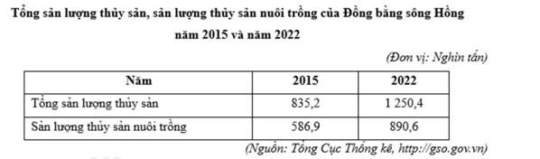 Căn cứ vào bảng số liệu trên, hãy cho biết tỉ trọng sản lượng thủy sản nuôi trồng ở Đồng bằng sông Hồng năm 2022 so với năm 2015 tăng thêm bao nhiêu phần trăm? (làm tròn kết quả đến một chữ số thập phân).