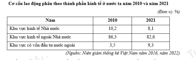Theo bảng số liệu, nhận xét nào đúng về cơ cấu lao động phân theo thành phần kinh tế nước ta năm 2021 so với năm 2010?