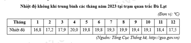 Căn cứ vào bảng số liệu trên, hãy cho biết nhiệt độ không khí trung bình năm 2023 tại Đà Lạt là bao nhiêu °C? (làm tròn kết quả đến một chữ số thập phân).