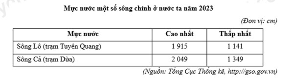 Căn cứ vào bảng số liệu trên, hãy cho biết năm 2023, sự chênh lệch mực nước cao nhất và mực nước thấp nhất của sông Lô tại trạm Tuyên Quang cao hơn so với sự chênh lệch mực nước cao nhất và mực nước thấp nhất của sông Cả tại trạm Dừa là bao nhiêu cm.