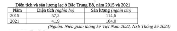 Cho biết năng suất lạc ở Bắc Trung Bộ năm 2021 tăng bao nhiêu tạ/ha so với năm 2015 (làm tròn kết quả đến hàng đơn vị).