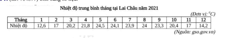 Căn cứ vào bảng số liệu trên, hãy cho biết nhiệt độ trung bình năm của Lai Châu năm 2021 là bao nhiêu°C (làm tròn kết quả đến một chữ số thập phân).