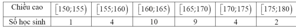 Thống kê chiều cao (đơn vị: cm) của các học sinh trong một lớp học ta có bảng số liệu. Độ lệch chuẩn (làm tròn đến hàng phần trăm) của mẫu số liệu ghép nhóm trên bằng bao nhiêu?