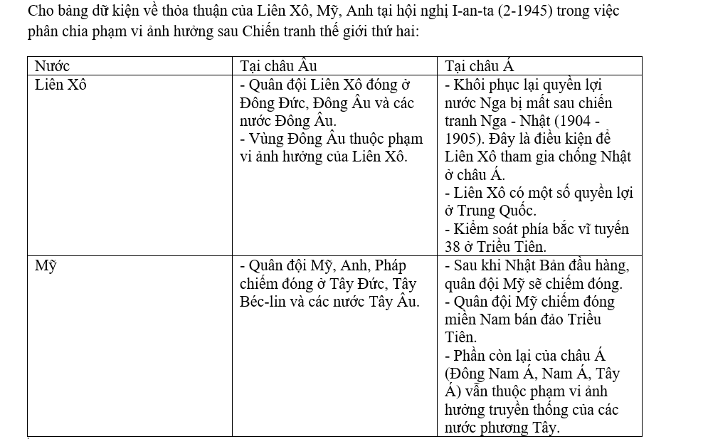 b. Theo quyết định của Hội nghị I-an-ta, khu vực Đông Nam Á thuộc phạm vi ảnh hưởng của Mĩ.